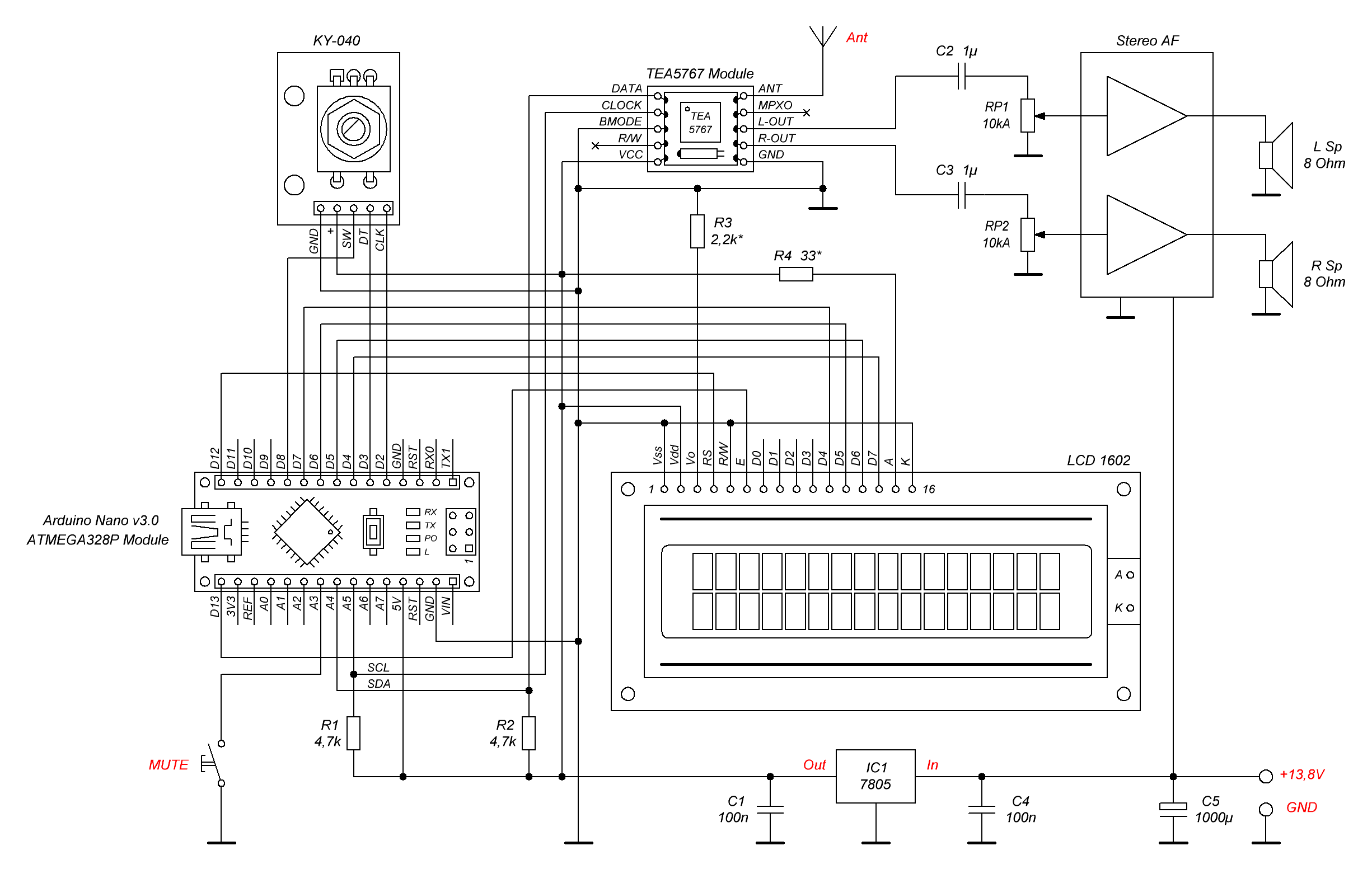 Kdyby to nemuselo být podle AR, je tu těch možností víc. Já s tím stavěl to, co je obrázku. Jen pohon displeje jsem si předělal na I2C. A hraje to docela obstojně. Možná by tomu slušela větší anténa, ale jako nouzovka s pohonem na powerbanku to jde. Zkoušel jsem několik variant, ale tohle chodilo asi nejlíp. Modul jsem připájel na malou DPS a na ní jsou jen kolíky na zasunutí do konektoru.