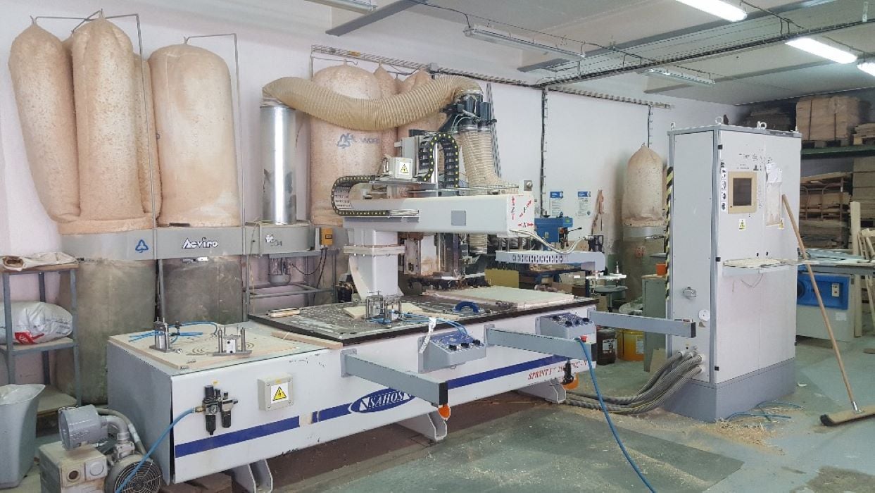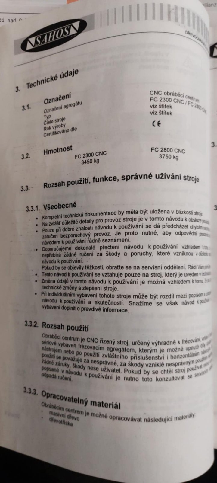 Jedná se o CNC dřevoobráběcí centrum značky SAHOS, typ Sprint FC 2800 se čtyřmi přídavnými vřeteny. Rok výroby 2002.