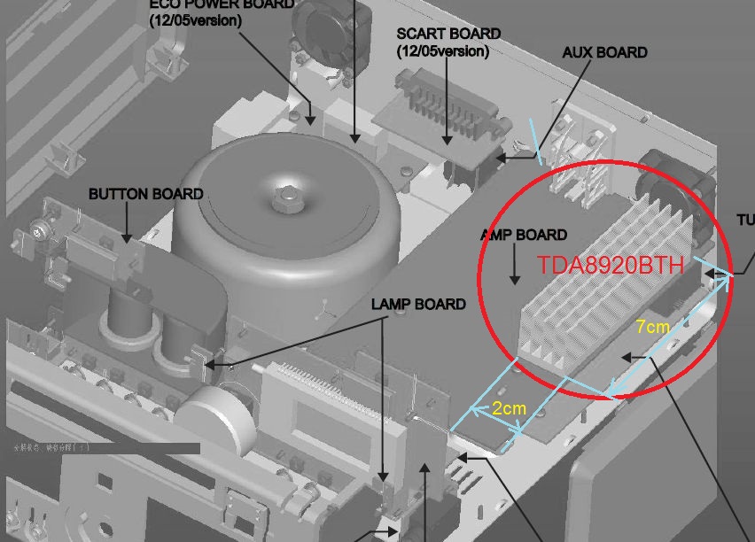 Ze zvědavosti jsem pořídil zmíněný kus. Fungoval tak, že po připojení do sítě se rozsvítila modrá kontrolka tlačítka ON a po jeho stisku zhasla, dál nic. Příčina se ukázala hned po rozsápání, vadné hlavní trafo (jak kráva). Trafo je převeliké protože krmí hlavně TDA8920BTH. Teď k dotazům: