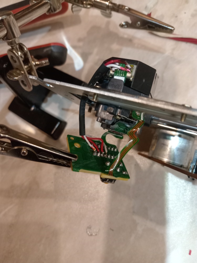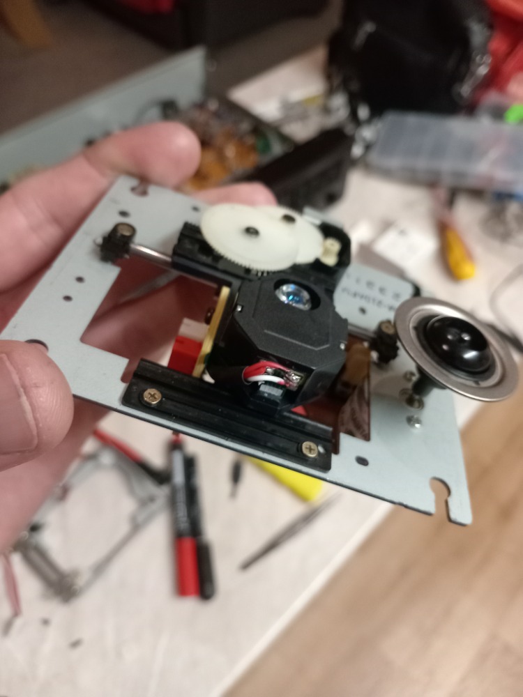 Po demontáži mechaniky ven jsem zjistil, že čočka ostří, a laser pálí. Když jsem to měl venku a náhodou jsem na špindl položil CD, tak to mělo najednou snahu točit špindlem, akorát mu to prokluzovalo, protože tam chyběl protikus. Bez protikusu bylo CD nad čočkou trochu výše, protože na špindlu je ještě pružina, která CD po otevření lehce nadzvedne. Vzpomněl jsem si (sem to tu na fórech někde zahlídl), že CD má být nad čočkou určitou vzdálenost a tady bylo prostě moc nízko a čočka nedokázala zaostřit. Nadzvedl jsem tedy špindl na osce motorku o kousek výš šroubovákem a přehrávač najednou čte CDa, origo i pálenky, nemá problém ani s dost poškrábanými.