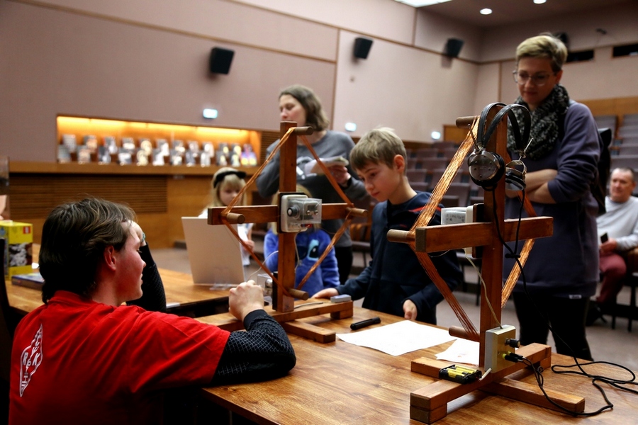 Děti si ovládání (šest posuvníků na obrazovce) v chumlu okoukají od předchozích a ozkouší. Výklad měli na morseovce a dalších stanovištích.