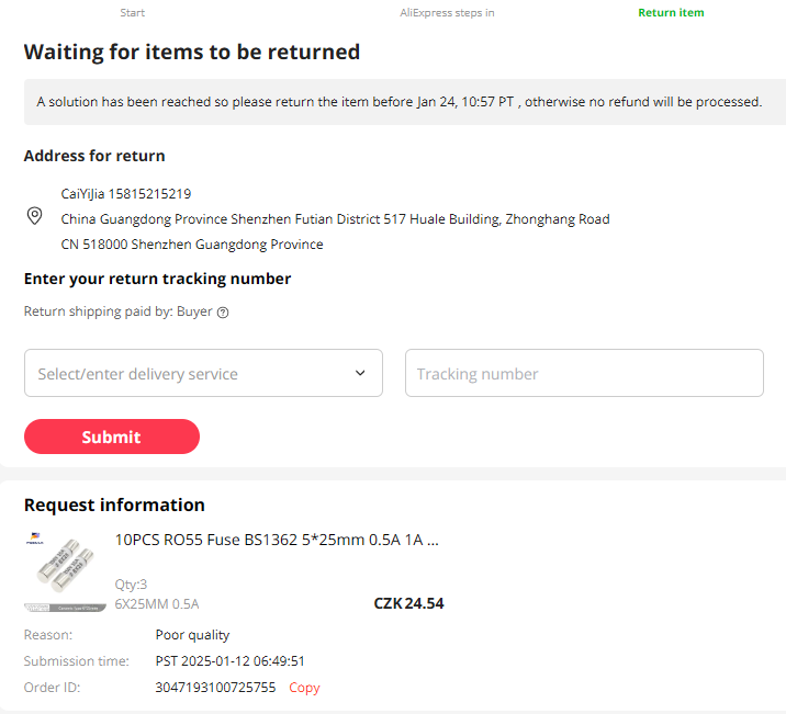 Pro ilustraci, jak to může být s refundací nerefundací nebezpečného zboží na Aliexpressu, ještě přidávám printscreen. Předložil jsem důkazy o nebezpečnosti položky, žádnou nabídku na dohodu o 75 % refundaci bez vracení položky jsem nedostal, položka je dál v nabídce.