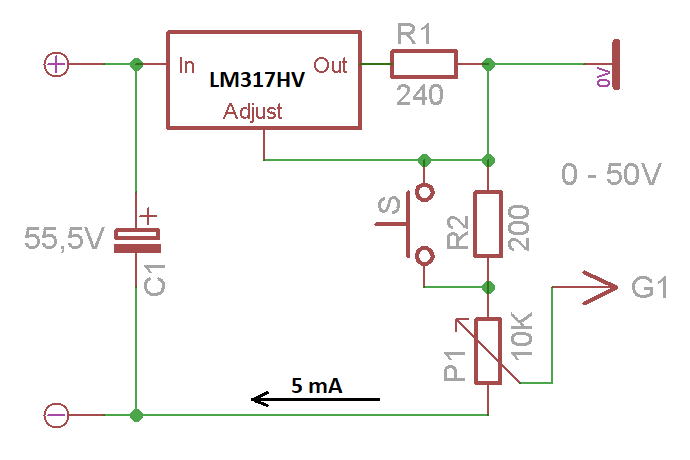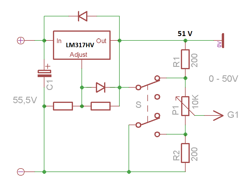 Zjistil jsem, že při zvýšeném napětí sítě kolem 240V je na filtračním C1 skoro 60V, takže LM317HV nevyhoví. Primár trafa je sice na 230 / 240V, ale má to význam jenom pro přizpůsobení žhavení.