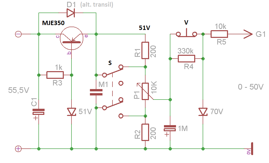 Měření strmosti použiju klasické - snížením předpětí Ug1 o 1V. Pouhé přidání odporu s úbytkem 1V nestačí. Při celkovém odporu děliče kolem 10k je úbytek závislý na poloze potenciometru. Je nutná stabilizace napětí nebo proudu. Z lineárních regulátorů je běžně dostupný pouze LM317HV (do 60V). Níže uvedená schémata jsou pouze principiální, bez blokování apod.
