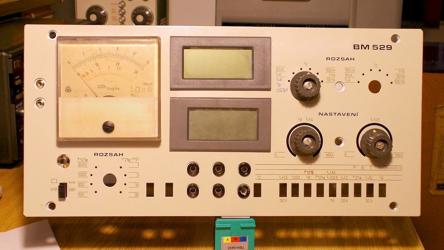 Přístroj bude v upravené skříňce od BM529, viz fotka. Elektronka se zasune do externího přípravku a propojí max. 6 vodiči do příslušných zdířek. Tím odpadne nutnost přepínání vývodů. K provedení lze mít jistě výhrady, ale pro moje potřeby to stačí (občasné odzkoušení pouze několika typů řady E). Proto je žhavení pouze 6,3V, případně lze použít externí. Původní ampérmetr měří Ia, digitální Ug1 a Ua / Ug2.
