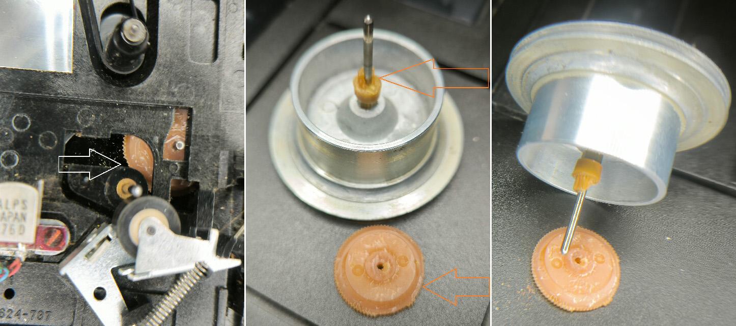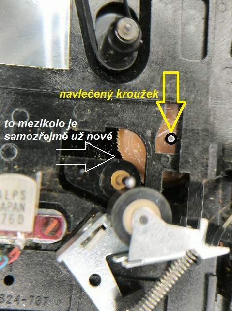 Ještě zkouším jedno vylepšení, kterým se při převíjení zpět spolehlivě zajistí, aby ozubení mezikola neškrtalo o pastorek na setrvačníku, a to zvětšením průměru čepu, aby ho výřez vozíku hlav držel o fous dál. Zatím jsem na ten čep navlékl přibližně dvoumilimetrový kousek izolace z vodiče CY 2,5 mm². Vypadá to, že se osvědčuje, ale je to přece jen dost měkký materiál, moc mu nevěřím. Je zbytečně tlustý, tak ať ten krok není nadměrný. Budu muset vymyslet něco trvanlivějšího a tenkostěnnějšího.