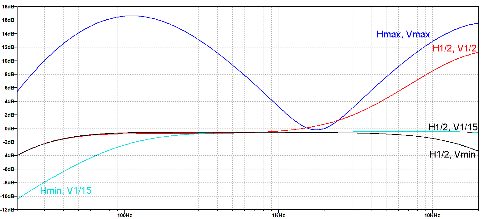 Charakteristiky na zatíženém výstupu pro reproduktor podle polohy potenciometrů korekcí.
