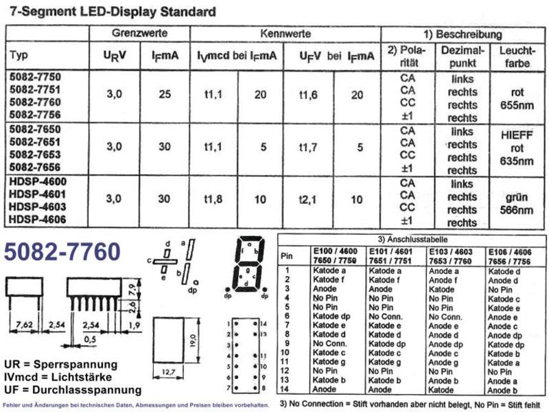 Podle schématu zapojení a rozložení na tišťáku se dá s určitou přesností rozložení vývodů určit. Ty DL7760 mají společnou katodu, ten LG350má společnou anodu. Prakticky se nedá s dostatečnou přesností určit jak jsou segmenty "abcdefgh" přiřazeny nožkám. Snad to zjistím z datasheetu řídícího převodníku PIC16F628.