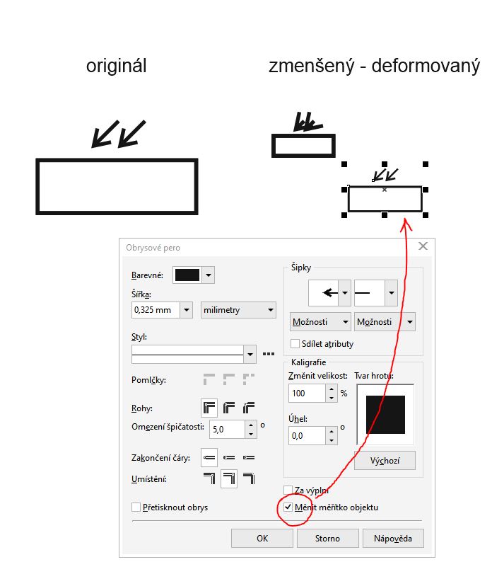 V Corelu je ale volba kde jde nastavit, aby se síla obrysu měnila spolu s tím jak měníš velikost výběru. Ve vlastnostech obrysu zatrhni poněkud zmateně nazvanou volbu "Měnit měřítko objektu" a pak se ti bude měnit síla čáry a velikost šipky spolu se změnou velikosti výběru bodů tvořících obrys. Má to vliv i na velikost šipky, tam je ale nějaké omezení minimální velikosti (proč, to se mne neptej), takže pokud budeš chtít jít pod velikost kdy se šipka začne zkreslovat, budeš si to muset převést na objekt, jiná cesta není. Nebo tu šipku místo použití atributu "šipka" nakreslit ručně dvěma čarama, pak se ti bude zmenšovat libovolně. Má to i jiné háčky, například když výběr pouze natáhneš do šířky, tloušťka horizonálních čar se nezmění a u ostatních ano apod, ale s tím se už musíš naučít žít.