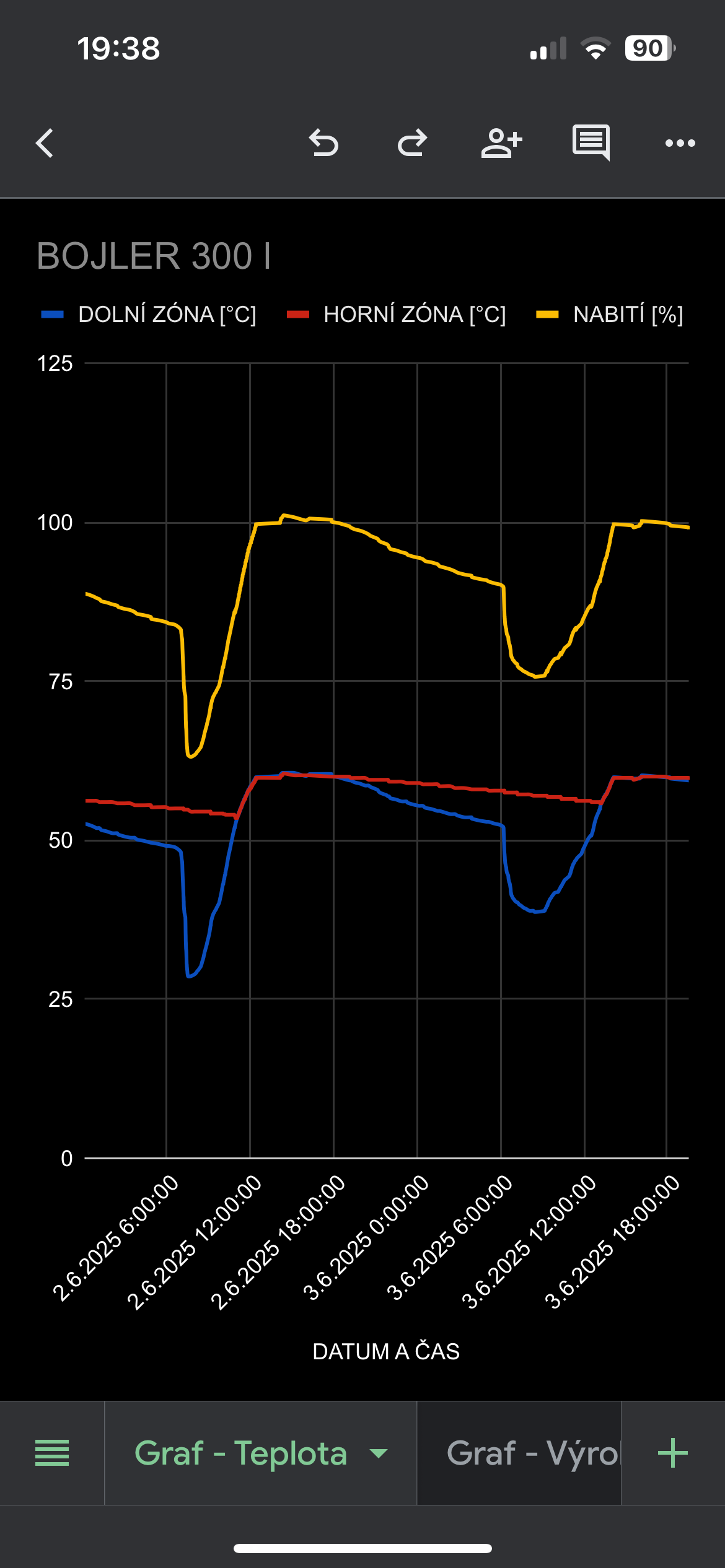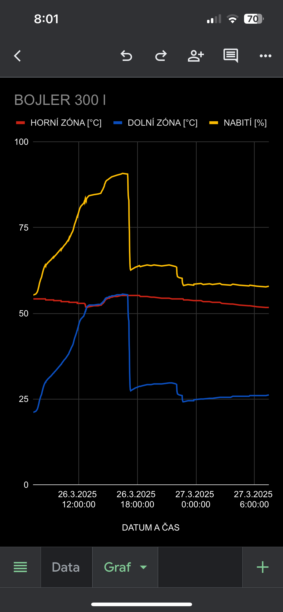 SHELLY pomocí webhook zapisuje naměřená data do Google Sheets. Hodnotu NABITÍ počítám z průměru hodnot HORNÍ ZÓNA a DOLNÍ ZÓNA, 10°C je 0%, 60°C je 100%. Výsledek je na obrázku.
