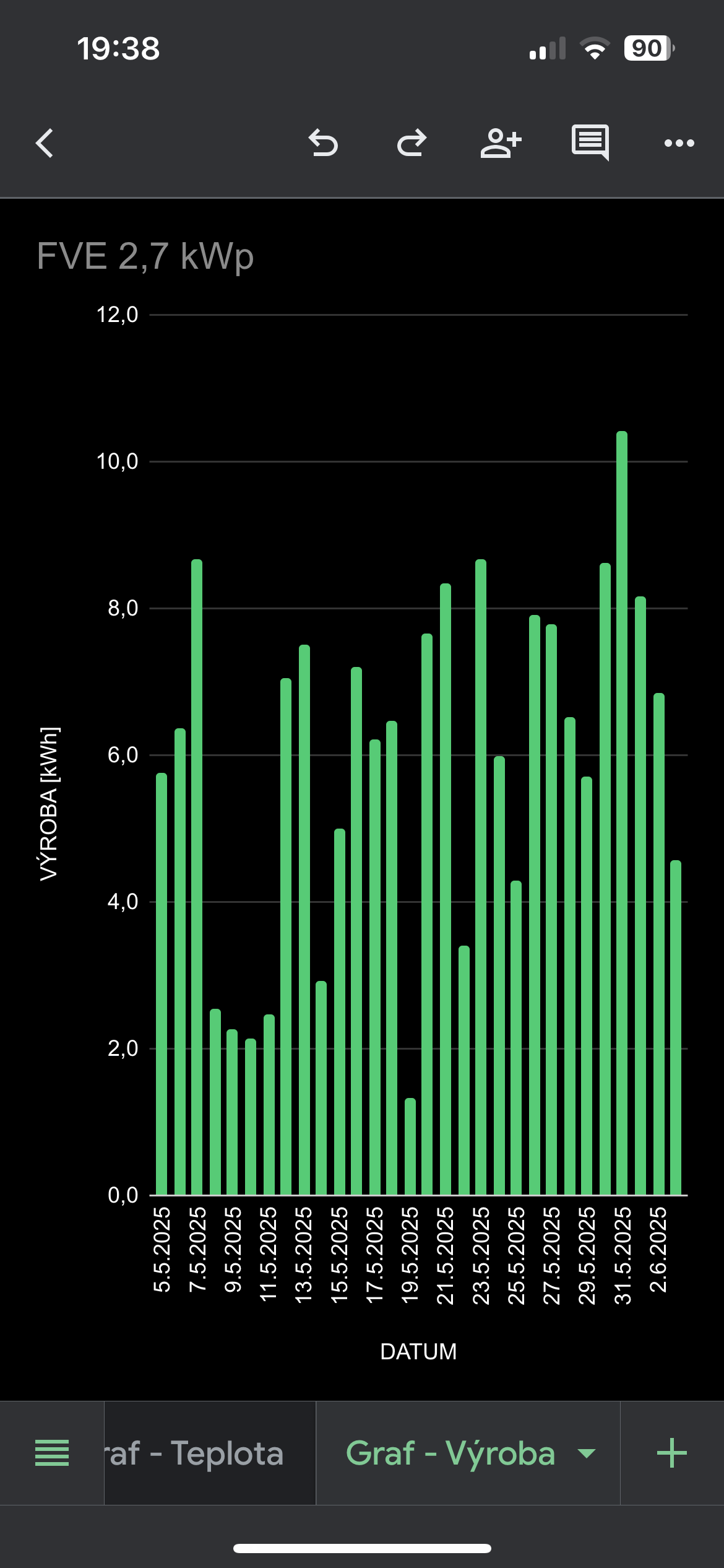 Navazuji na můj předchozí příspěvek. Pouze softwarovými prostředky se mi podařilo dosáhnout způsobu měření a záznamu denní výroby na základě kladných přírůstků teplot známého objemu vody. Tento způsob měření z principu ignoruje výrobu v době odběru vody/poklesu teploty, když však čísla porovnám s elektroměrem, liší se v jednotkách procent. Výstupy viz obrázky