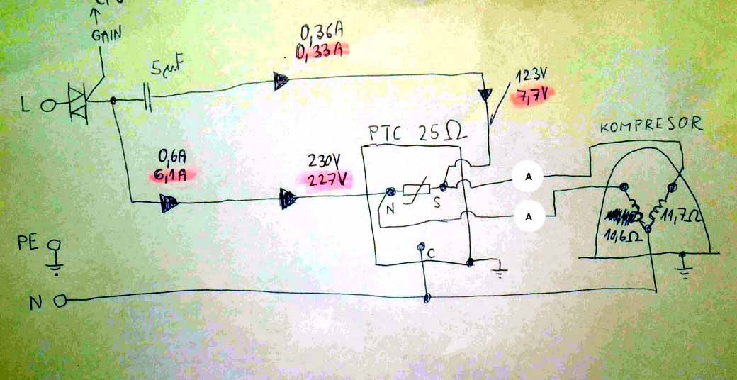 Vím, že nemám změřený přímo proud do vinutí kompresoru, ale jelikož je na pozistoru 227V a 7.7V tak tímto je pozistor uzavřen a teče vše do vinutí.