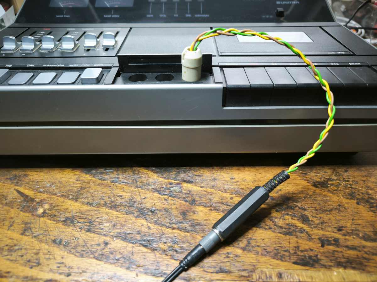 Když jsem potřeboval připojit sluchátka při repasi kazeťáku Unitra M551S ((popis zde), hledal jsem, jestli mi nezbyl v zásobách sedmikolíkový konektor DIN, že z něj vyrobím adaptér. Po stěhování trucovny mi zůstala hromádka materiálu v různých krabicích na přebrání. Přitom jsem našel adaptér zbastlený před lety, v což jsem ani nedoufal. Nemá kolík 1, pochopitelně, signálový konektor DIN7 uprostřed žádný neměl, ale, jak píšu výše, pořád v konektoru ještě dvě ukostřené dutinky zbývají.