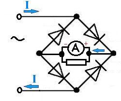 Projde diodami můstku stejně jako ústrojím. Stupnice je lineární, systém měří střední hodnotu a ukazuje efektivní, pokud je proud sinusový. Jediná nevýhoda je relativně velký úbytek napětí. Jsou aplikace, kde to nemusí příliš vadit.