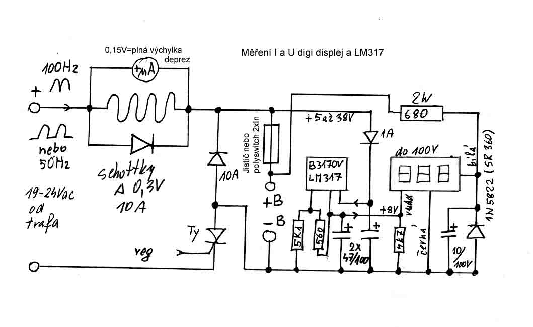 Vidím, že schema lidi stahujou tak přikládám ještě jinou variantu. V případě, že má trafo 24Vac naprázdno a více je třeba použít zapojení V metru s LM317 nebo jinou variantu snížení napětí pro dislej a ventilátor. Ještě jednou nedoporučuji používat tyto nabíječky na baterku připojenou do auta.