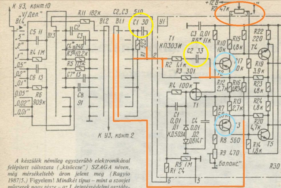 Myslím že není třeba nového vlákna, dám to sem. V poloze vstupního děliče 5_ 0,5_0,05 je R2 přibližně v polovině rozsahu, v poloze 2_0,2_0,02 je otočen doprava, v poloze 1_0,1_0,01 je úplně vpravo a v zahřátém stavu už nelze stopu dostat doprostřed, je o kus níž. Abych to viděl tak jsem si to vyznačil a vidím, že za to může sekce B1.1, viz malůvku. Teď jenom - má svod jeden z C1,C2 nebo je třeba vyměnit, jak už bylo navrženo, T2 a T3? Začalo to potřebou občas mírně hnout R2, pak jsem to nechal zapnutý přes noc a teď už, jak jsem zmínil, v teplém stavu je stopa na rozsahu 1_0,1_0,01 pod středem a už ji neposunu kam potřebuju. Než do toho vlezu....