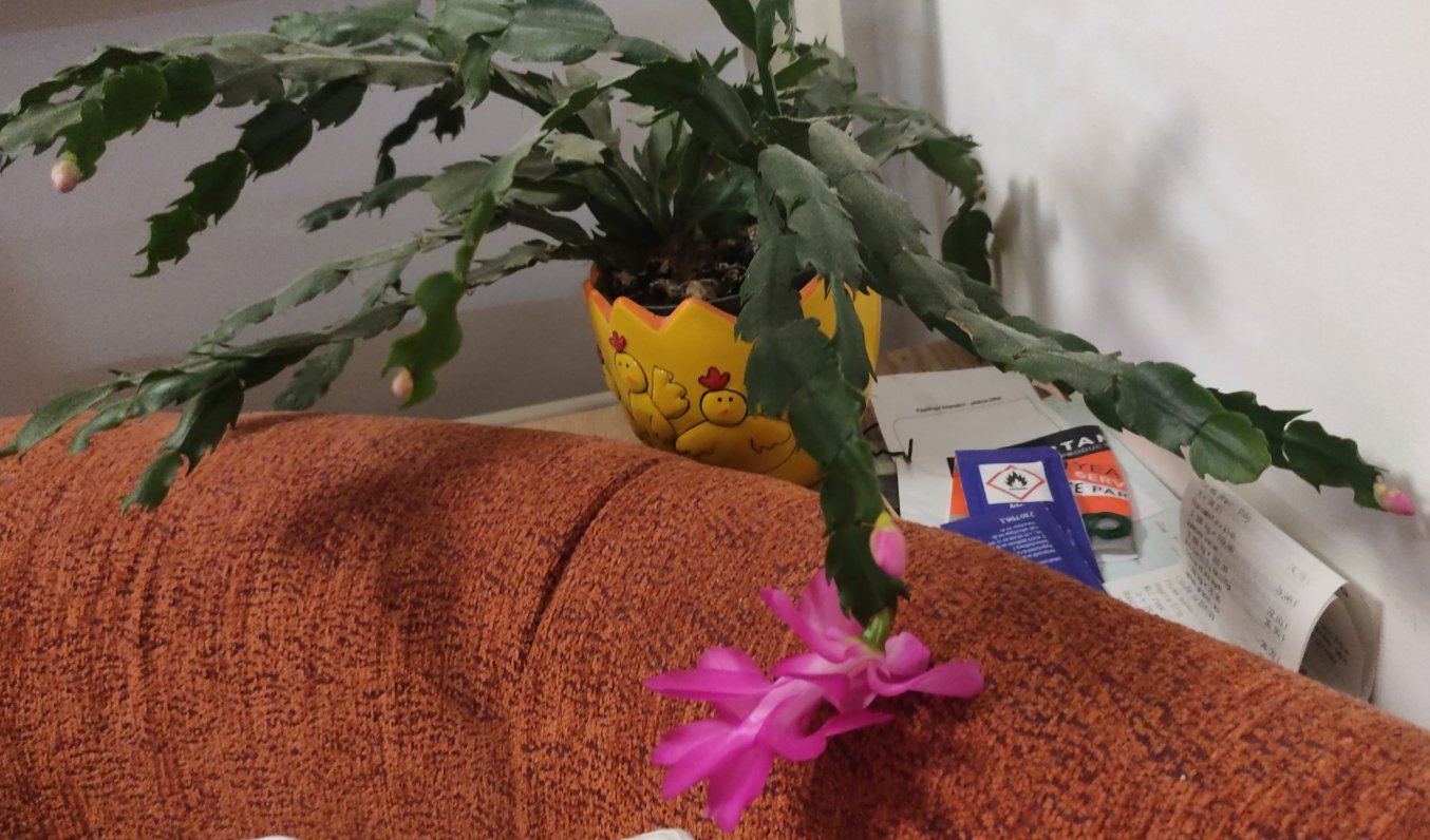 Mám doma ten samej, babička tomu říkala "vánoční kaktus" - botanicky "rod Schlumbergera", ale tohle je jeho "velikonoční" varianta - botanicky "rod Hatiora" = kvete ne listopad-prosinec, ale spíš konec ledna-únor-březen. Na fotce z 5.3. je vidět, jak měl napučíno na květy. A na profláknutý datum 8.3. jsme se byli se ženou juknout, jak začínají nakvítat bledule - ne, na vyhlášenejch "záduleckejch lesních loukách" to není, je to na jinou stranu od Třebový než Zádulky, ale přesnou lokalitu podle letitý dohody s lesákama neprozradím - to místo je sice schovaný před přímým pohledem, takže o něm ví jen pár místních - ale na rozdíl od zádulecký louky, která je 2km od běžný silnice a vede k ní jen pěší/cyklostezka se zákazem vjezdu pro motorový vozidla, vede ani ne 300m od týhle lokality poměrně frekventovaná silnice a nebyl by problém, aby to tam někdo "vybral" - a to nechceme.