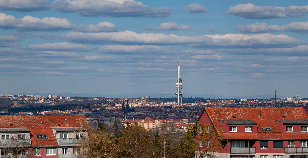 Dneska byla pěkná viditelnost, z Prahy (od Dívčích hradů) bylo krásně vidět Krkonoše. Neměl jsem s sebou delší sklo než 85 mm (ekvivalent kinofilmu 127,5 mm).