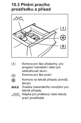 U její pračky tam žádné takové klapky jako máš ty nejsou viz reálná fotka. Donutil jsem ji najít návod a opravdu jediná hláška v celé příručce o tekutých prostředcích je cituji "Používáte-li tekuté prací prostředky: Tekuté prací prostředky používejte pomocí dávkovače přiloženého k těmto prostředkům" Nic víc tam opravdu není, ani čárka.