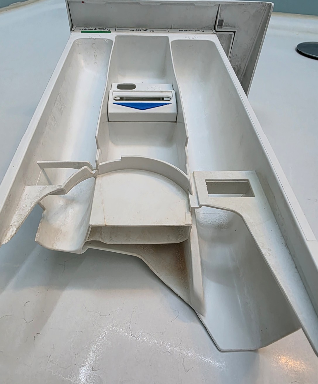 Bodejť, protože jejich konstrukce proběhla ještě v dřevních dobách, kdy kapalná složka byla nanejvejš aviváž, co se dávala do máchání - a o tom se v tenkrát běžně návodech psalo, že se má nalejt do zásobníku pro normální prášek při započetí máchání, žádná extra nádobka nebo oddělení násypky pro to nebylo. Všecky prací prostředky byly sypký, na gely a gelový kapsle se technologicky přešlo až během posledních cca 20 let.