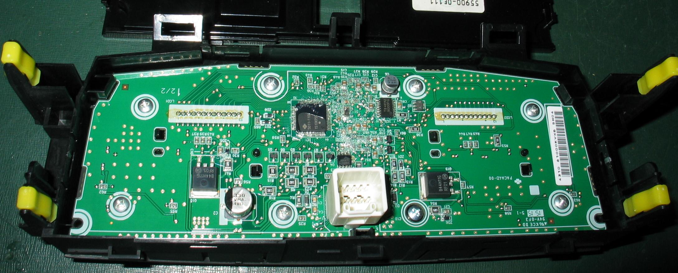 Doniesli mi ovladanie automatickej klimy z Toyoty Verso - oznacenie Sumitomo Electric 55900-0F111. Nesvietia 4 indikacne LED - AUTO, A/C, DUAL a recirkulacia. Tieto 4 LED vyzeraju inak ako vsetky ostatne, takze su asi vadne (LED1-LED4). Vsetky ostatne pri teste multimetrom svietia, ale tieto nie.
