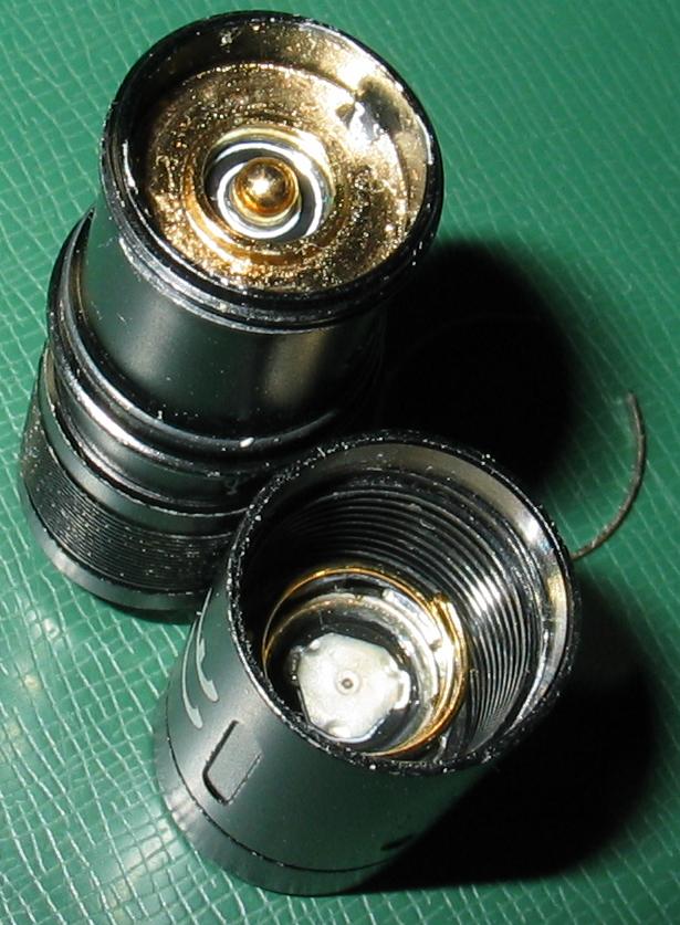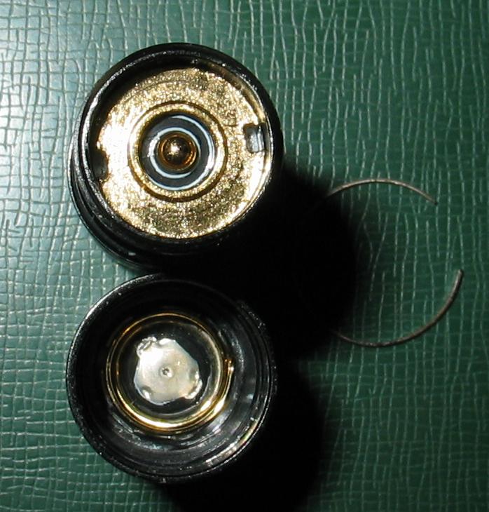 Zostala horna cast s LED a spodna s bateriou. Ten spodok sa mi nedari rozobrat - je tam kruzok zlatej farby (tvori - pol). Pokusal som sa ho pinzetou otocit alebo vytiahnut, ale ani sa nepohne. Je to tam asi nalisovane alebo co.