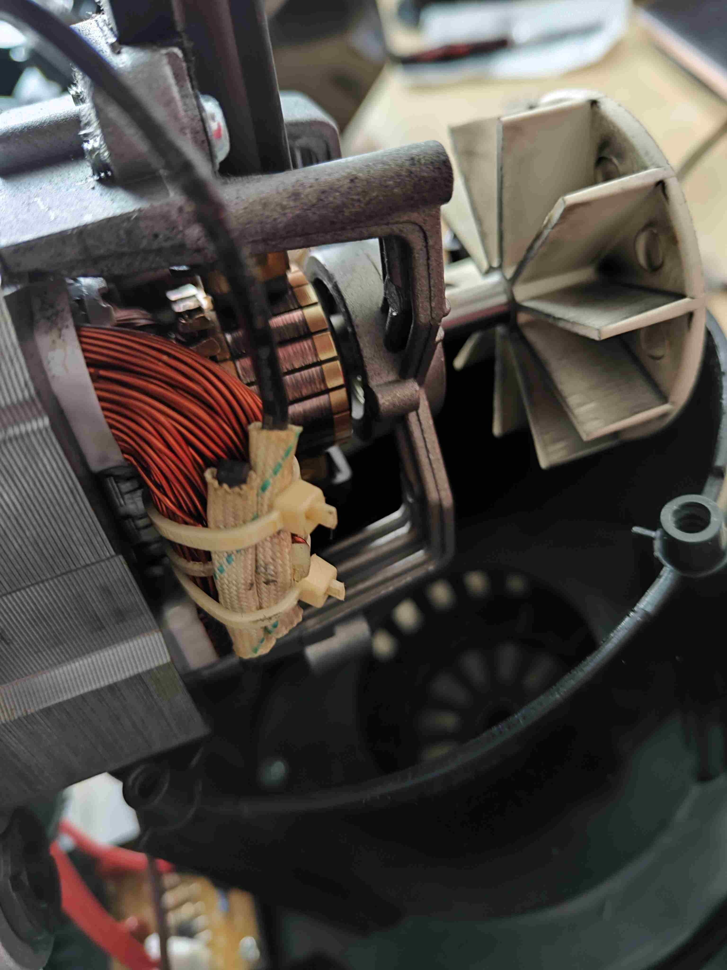 Zápach, iskrenie od uhlíkov a zvláštny svišťavý zvuk, ak existujú, tak naznačujú zničený rotor. Je tam asi plynulá regulácia, nemôže sa tam stať to, čo u motorov šijacích strojov, že aj pri stojacom motorčeku stále tečie do neho prúd a aj keď ho neroztočí, zničí rotor? U šijacích strojov je to skoro stopercentná závada, že šička keď uvolnila pedál regulátora a neodpojila šijací stroj od elektriny vytiahnutím zástrčky, tak sa motor pokazil zostatkovým prúdom neustále tečúcim cez regulátor.