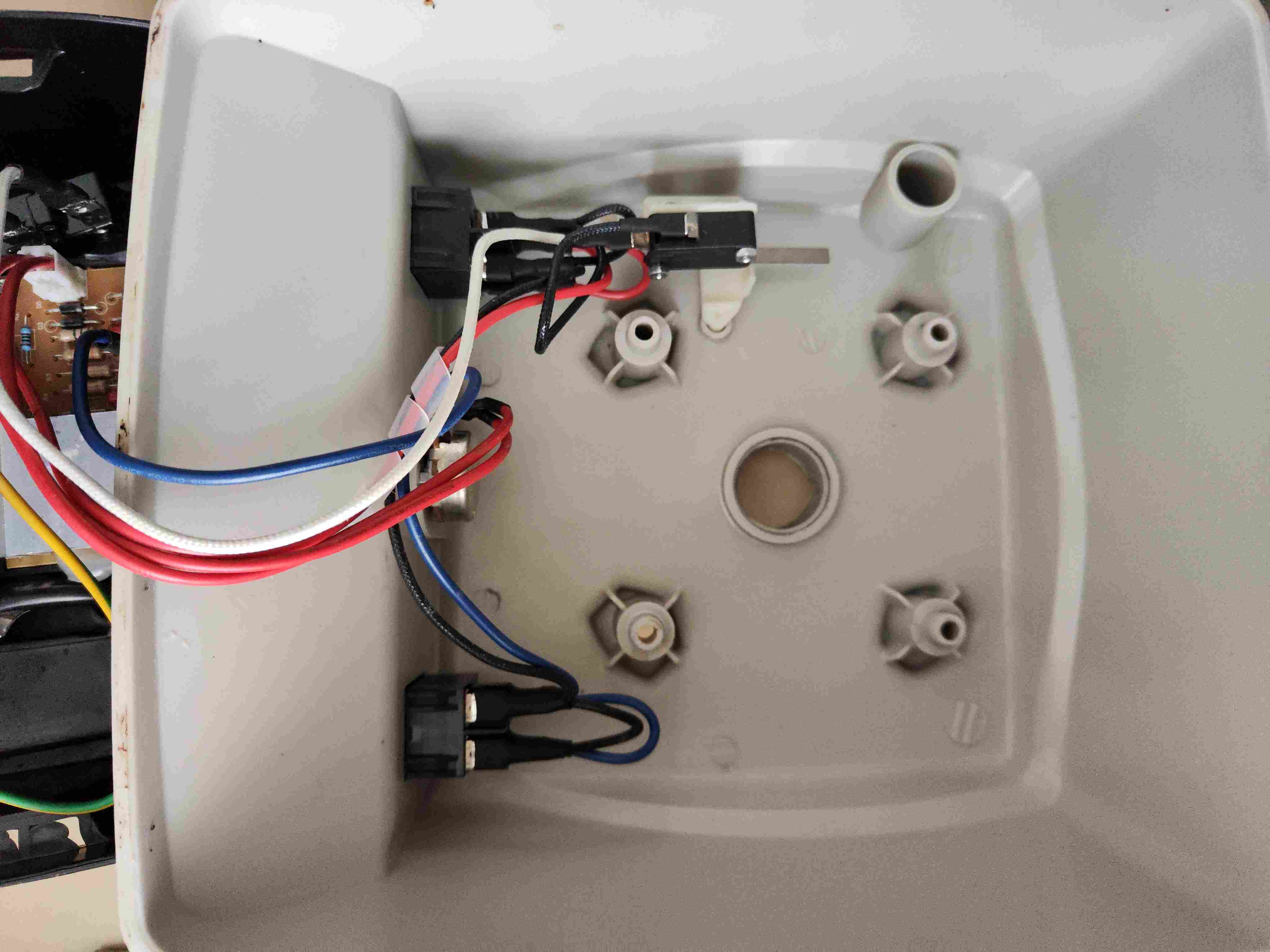 - případně fastony mikrospínače detekujícího instalaci nádoby, které jsou 4,8mm místo 6,3mm jako zbytek vypadají trochu postižené teplem, a jeden je volnější. Každpoádně mikrospínač je na 230V/16A.