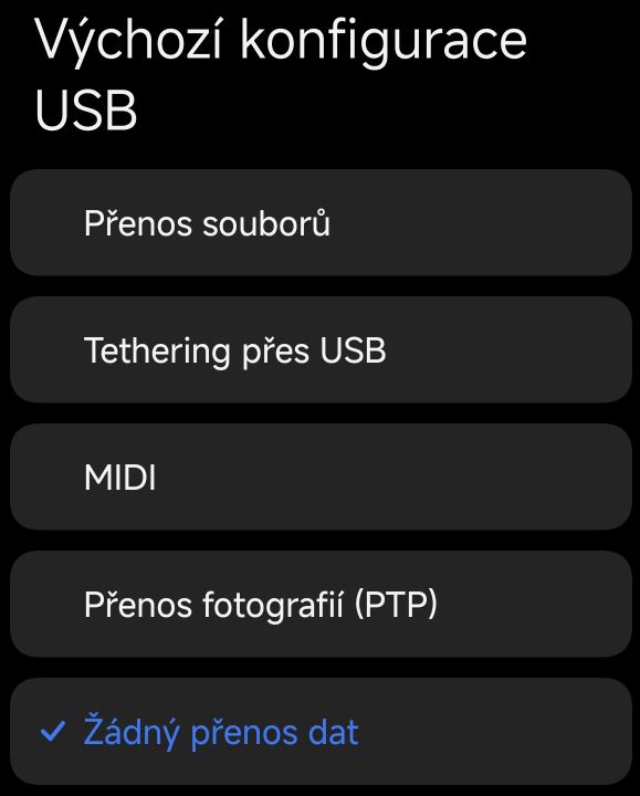Předpokládám, že i Samsung by měl mít v menu pro vývojáře možnost výchozího nastavení po připojení kabelu.