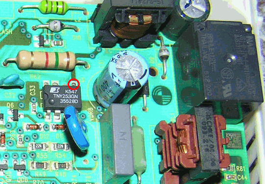 Samozřejmě na zdrojovou část. Změř napětí na pinu 5 TNY253 (primární strana zdroje) - viz obrázek. POZOR - usměrněné napětí sítě!