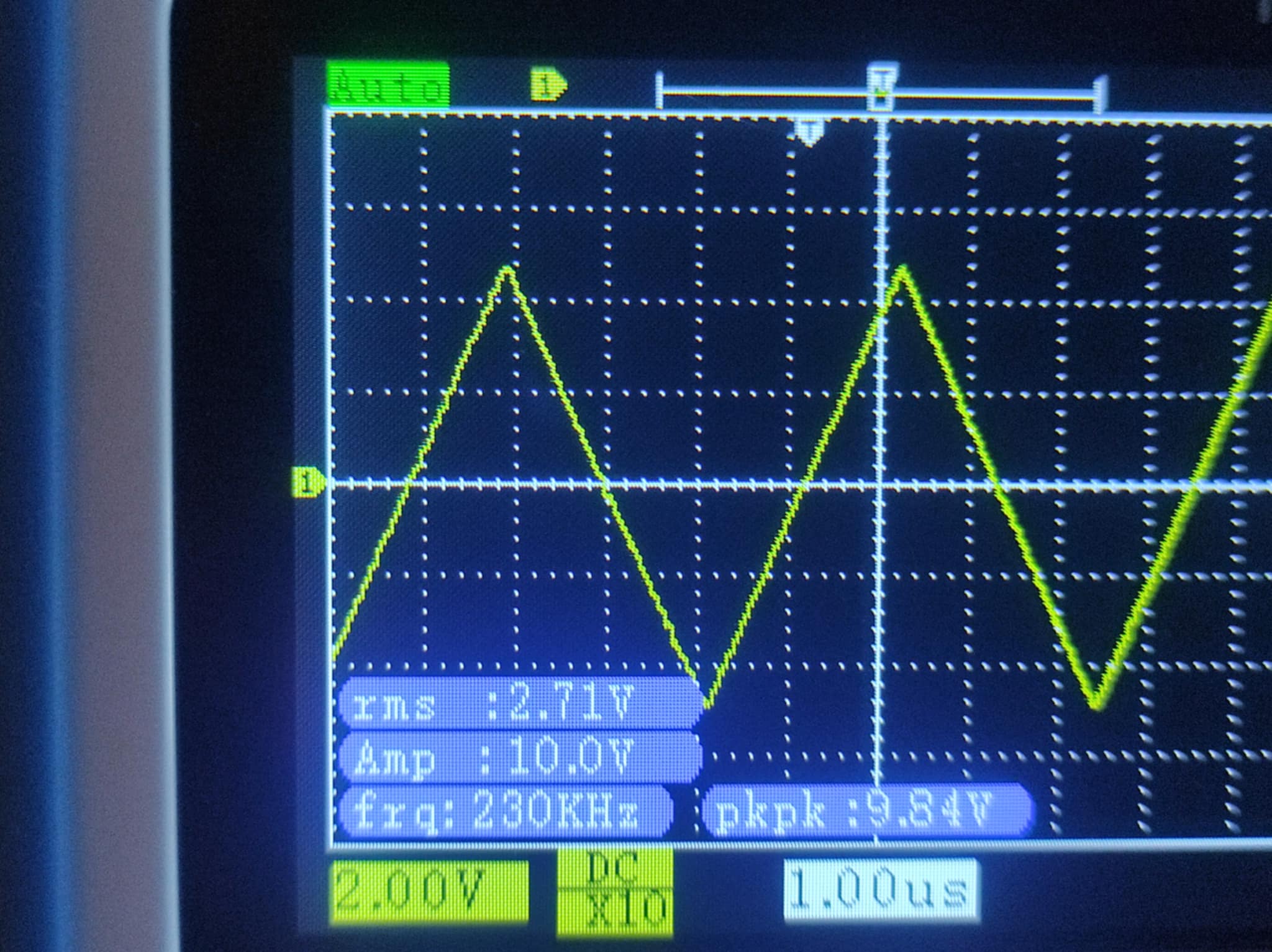 Spodní tranzistor 2N3904 v level-shifteru jsem vyměnil za mosfet BS170 a horní za 2SC2369 a problém zcela zmizel, střída je 50/50 a trojúhelník je správně špičatej. Smile