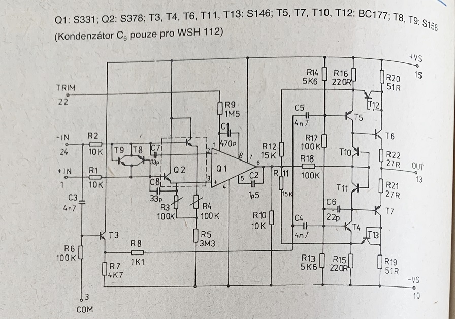 Zdravím, ze zvědavosti jsem po víc než 40-ti letech vytáhl ze šuplíku hybrid WSH111 (Tesla Lanškroun). Je postavený kolem uA709 + mnohem lepší koncový stupeň + dopředná korekce. Že je velmi rychlý (SR = 250V/us) víme dávno ale zajímaly mě i audio parametry, a dost mě to překvapilo. Až na vyšší šum naprosto perfektní.