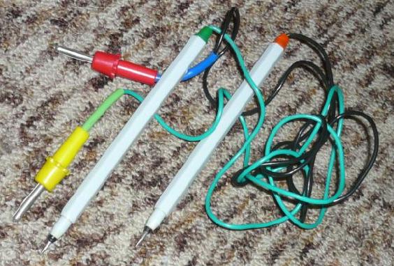 Ostré, pevné nerezové hroty, které se nelámou, silikonový měkký kabel s nízkým odporem. Používám už jenom tyto, není problém propíchnout izolaci kabelu, nebo lak na DPS. Při neopatrné manipulaci se občas píchnu do prstu.