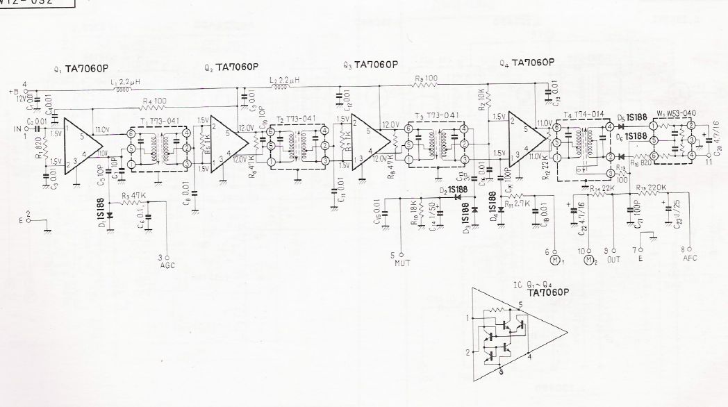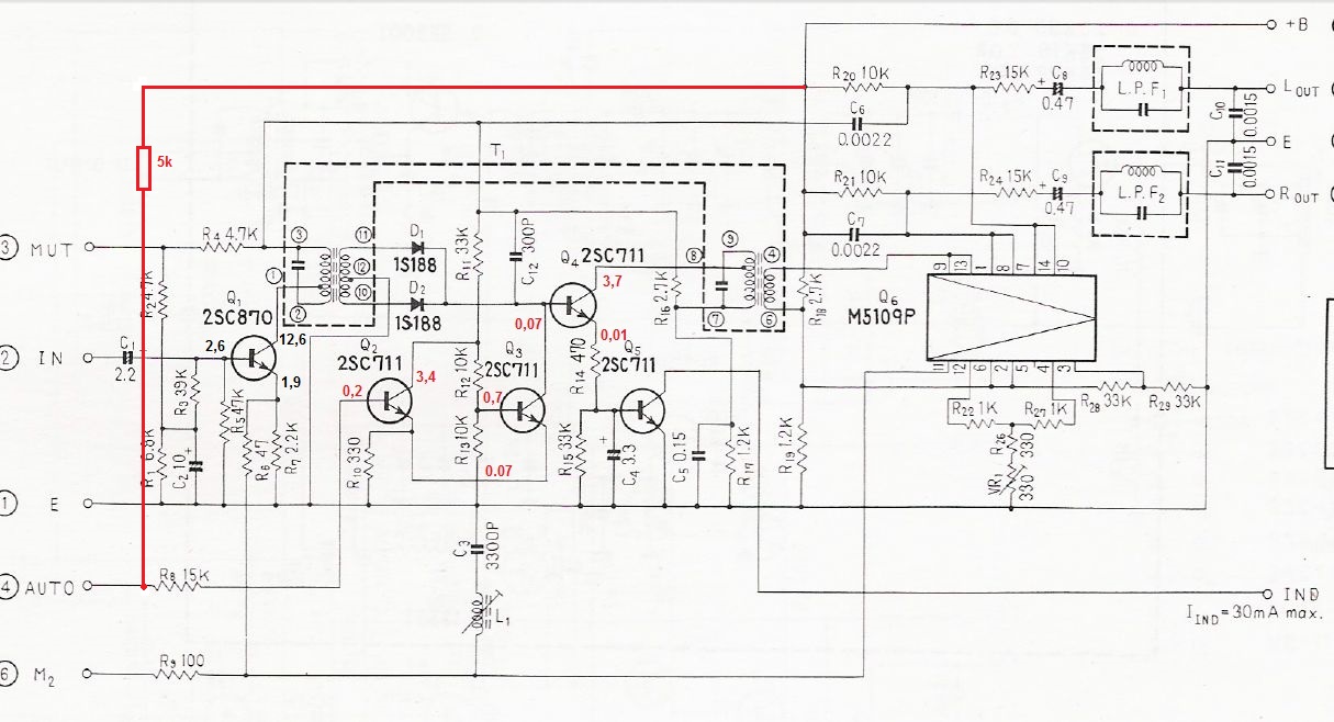 Tranzistory Q2 a Q3 v dekodéru tvoří hysterezní obvod, který od určité úrovně stejnosměrného napětí z diod zdvojovače pilotního kmitočtu překlopí, Q3 zavře a otevře cestu signálu přes Q4 na laděný obvod 38 kHz. Pak může úroveň pilotního kmitočtu i klesnout, než obvod překlopí zpět a zablokuje cestu pomocné nosné. Tu potřebují diferenciální stupně v M5109P (µA3054PC) pracující jako přepínač časového multiplexu k rozhození signálu do levého a pravého kanálu.