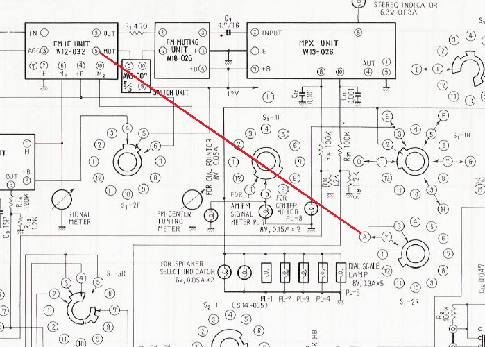Ano, došel jsem k podobnému závěru. Tady mě spíš dráždí to, že nemůžu najít kam vede A z přepínače a že teď nelze zvolit MONO, resp při jeho volbě je pořád aktivní volba STEREO. Osciloskopem na pinech 9 a 13 lze vidět při jaké velikosti pilotního signálu sepne STEREO. Udělal jsem čitelnější kopii ale hledání kam vede A je stejně marné. Nějak to bude souviset s mf dílem ale napětí na mute je moc malé (a vede jinam) na to aby se spustilo stereo. Už jsem zkoušel jít po drátu ale ukázalo se, že bych musel rozebrat půlku přijímače.