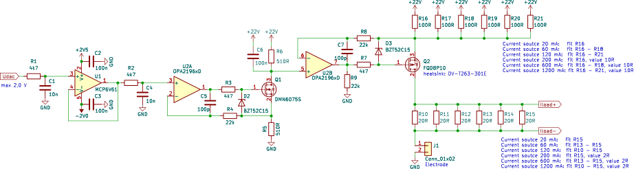 Na konektoru J1 je požadovaný proud. Odpory R10 až R15 jsou pro měření skutečného proudu. Nemusí být osazeny. Napájení U2 bylo +30 V a -3,3 V.