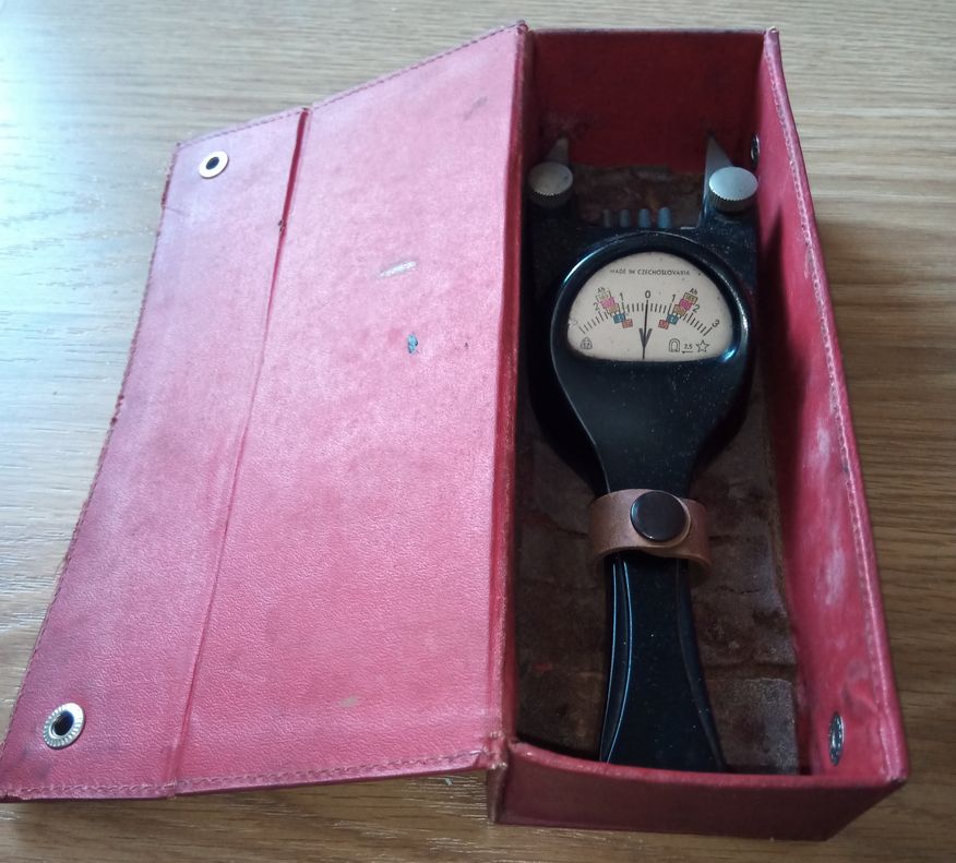 Voltmeter aj krabička má výraznú rokmi získanú patinu.
