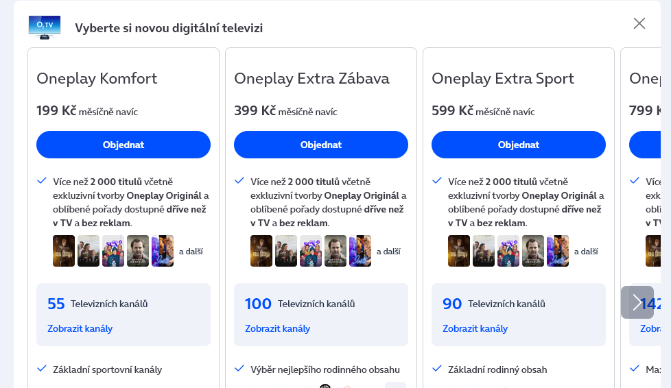 Vim ze se zde uz Oneplay probiralo, ale mam specificky dotaz, takze zakladam nove vlakno. O2 mne take automaticky prevedli na Oneplay. Puvodne jsem mel nejlevnejsi O2 TV Bronzova, ale ty kuy mi po prevodu automaticky nastavili o stupen drazsi Oneplay Extra Zabava. Proto bych ho chtel downgradovat na nejlevnejsi Oneplay Komfort, ktery stoji "jen" 199 Kc: