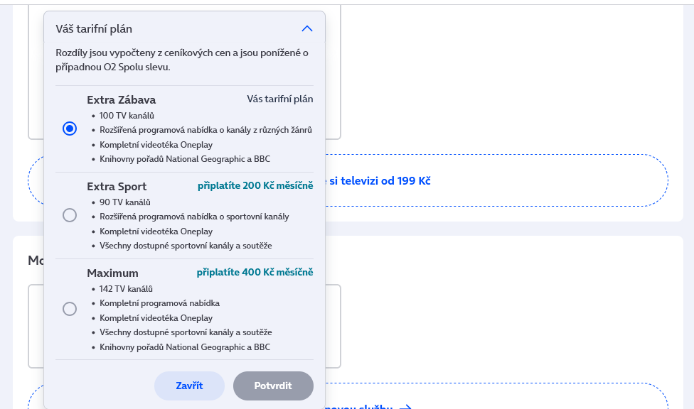 Kdyz kliknu na velke tlacitko "Pridejte si televizi", tak uz muzu nejlevnejsi tarif Komfort vybrat, ale... co se stane pak? Nebudu pak ty kuy chtit, abych platil Komfort i Extra Zabavu? Navic tam pisou, ze ma prijet jakysi kuryr, pred kterym bych mel smlouvu osobne podepsat. (K cemu pak to slavne Moje O2 vlastne je?)
