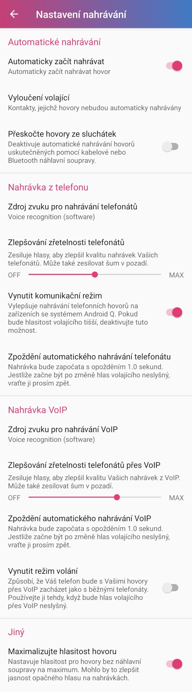 Ještě zde dávám obrazovku nastavení nahrávání, které mám v aplikaci Cube ACR viz přiložený obrázek.