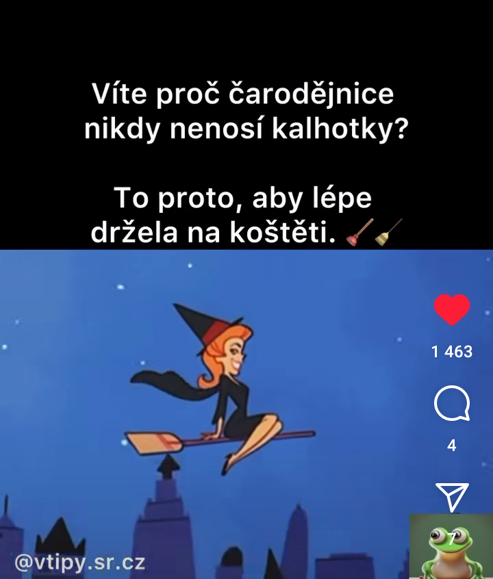 U té čarodějnice divné. Ono to koště je u čarodějnice symbol masturbačního zařízení. Když napíšeš takový vtip, deklaruješ vlastně nevzdělanost v daném oboru. Wink