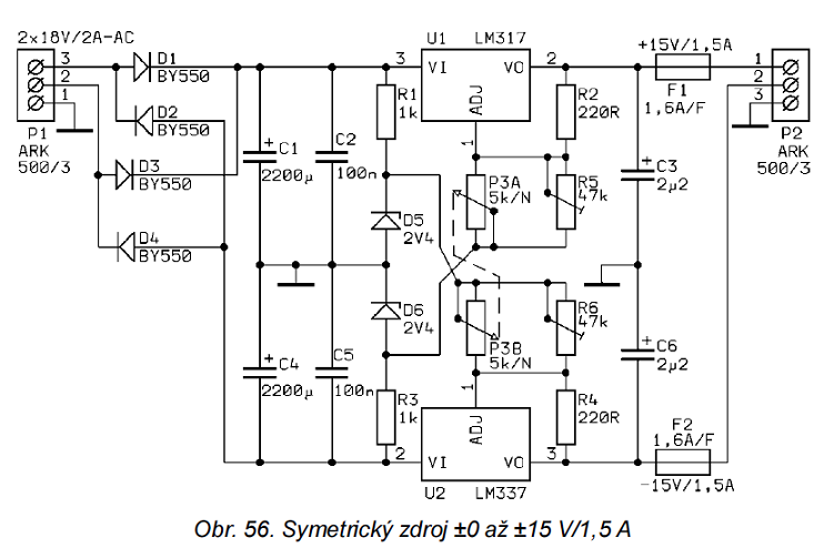 Tady máš regulovanej symetrickej zdroj od nuly až ± 15V. Kdysi jsem si ho postavil ve variantě do ±25V. Aby se na malý výstupní napětí a velkej proud moc netejraly stabilizátory, tak je na potenciometru vačka, která přepíná přes silový kontakty mikrospínače odbočky na trafu.