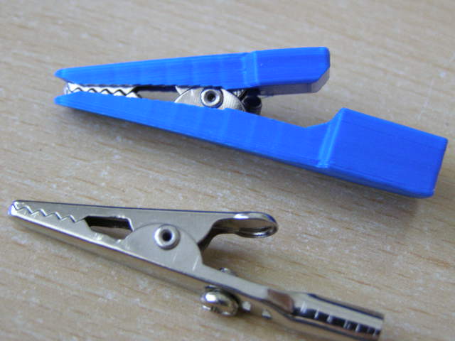 Na izolovanou svorku jsem použil neizolovanou krokosvorku z Lidlu za pár čudlíků. Ta je o trochu větší. 3D svorka není taková lakýrka jako Fluke ale mě to stačí a v podstatě to nic nestálo. Teď to můžu mrskat jako Baťa cvičky. Je třeba výtisk postrašit pilníkem v díře a sedí to na desetiny. Stl se trochu nafouklo každou dodatečnou úpravou, tak to má asi 2Mb. Tak jedině přes SZ.