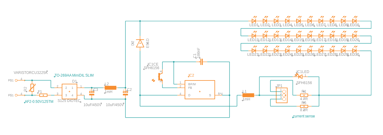 PS: Mám na indukčnosti kod 107, už jsem jaksi vyšel ze cviku ale nevím co je to za hodnotu, z touhle už je proud LEDkama 70mA (předtím jsem tam měl 102 to je snad 1mH)
