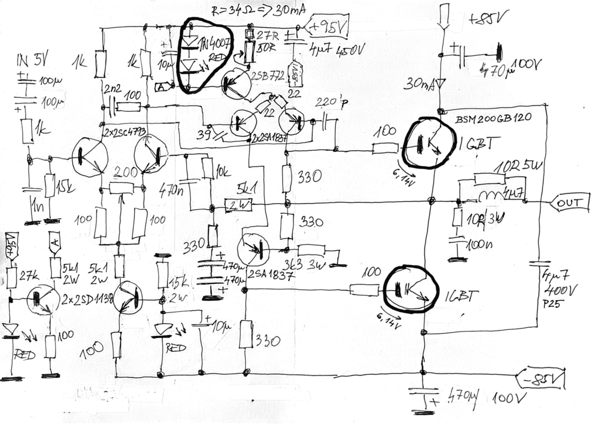 Tehdy tomu moc nerozuměl jak to počítat, tak dával všechny odpory zkusmo dokud cihla nezačala hrát. Když to nyní spočtu, tak Ufwd Ledka, Schottky, odpory 820R v kolektorech 1. dif při Iconst = 11mA 100R a 220R v 2.dif až zdroj konstantího proudu budiče mohl začít fungovat a při I =55mA 2.3V byl současně mimo saturaci a odporem 23R bylo Uge=6.14V začal téct klidový proud a smyčka mohla regulovat, ztrátový výkon budiče tehdy byl 2.2W+4.4W. Very Happy Takže všecky napětí a proudy na původním zapojení sedí a proto to jede na první zapnutí.