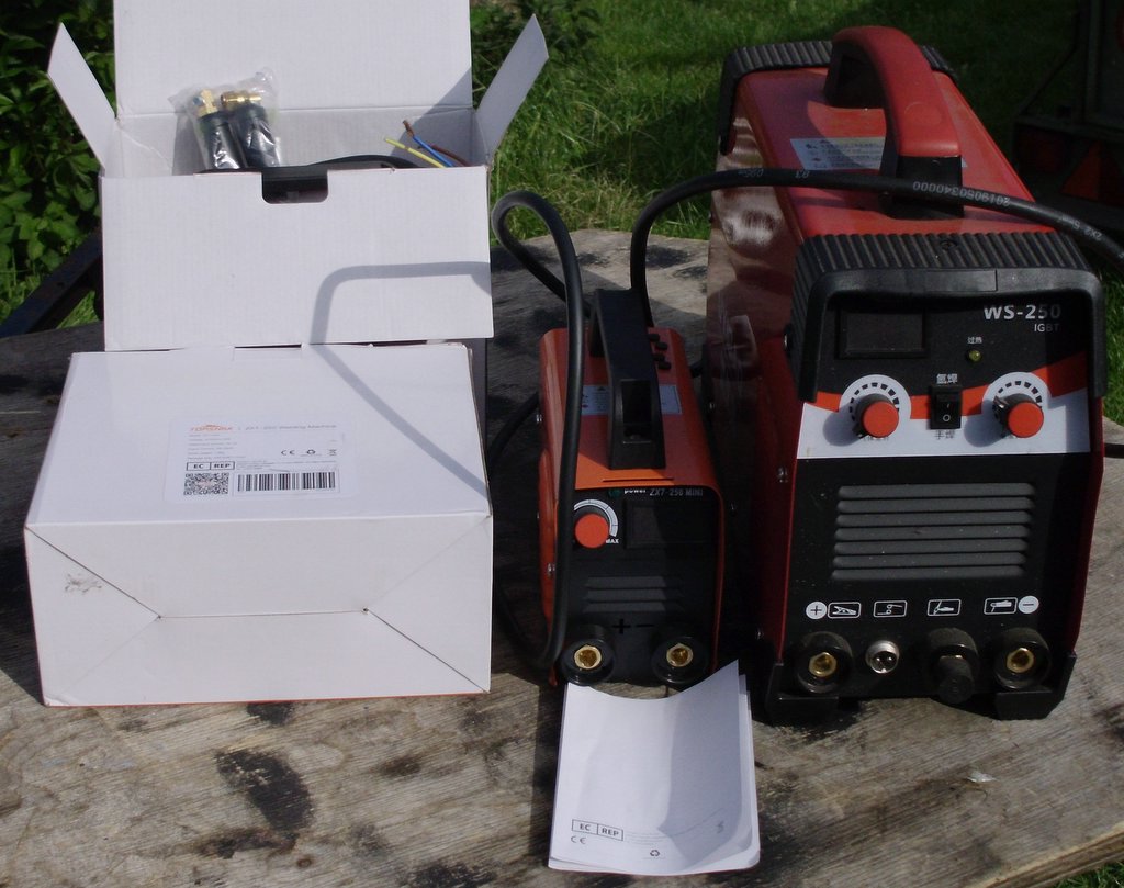 Pro případné zájemce . Ani na samotné ZX7 není CE , ale jak vidíš je jinde . Bednu od toho druhého s hf TIGem za 2500,- nemám , na samotném invertoru také není . Můžeš si najít ND a hlavně výstupní trafo , které má alespoň viditelně dvojitou izolaci . Topografii DPS jsem neřešil , když bude někdo chtít , ať se staví , budu i bude k dispozici . Ten malý skrček má přívod 3x , ten velký jen 2x . No nekupto za pětikilo i s konektory na svářecí kabely ....... Původně zakoupeno jako nabíječky pro aku pro FVE . Zatím před realizací . K tomu mám 4ks bloků do autoaku po 12S , jenom musím znovu vytvořit vývody z bloků , při testech je uřezali .