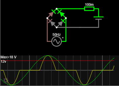 Tak si to kurwa namaluj. A pozvi si k tomu i Herr Kirchhoffa, aby ti vysvětlil, kdy kterým směrem teče proud mezi trafem, usměrňovačem bez filtrace a akumulátorem v závislosti na momentální fázi sekundárního napětí.