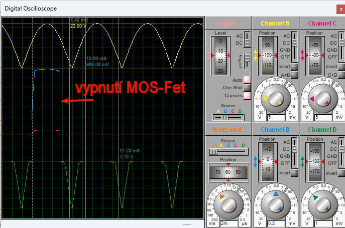 Vypnutí MOS-Fetu přichází ještě v době trvání proudového impulzu.