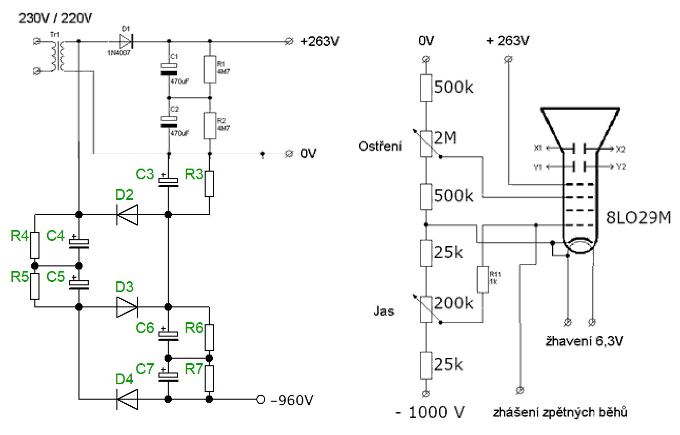 Abych nechodil kolem horké kaše, i přes to že momentálně mám v násobiči 6x60 uF napětí na výstupu je přibližně 650 V což je pro 8LO29 málo a tak hledám řešení jak se dostat k uspokojivému napětí.