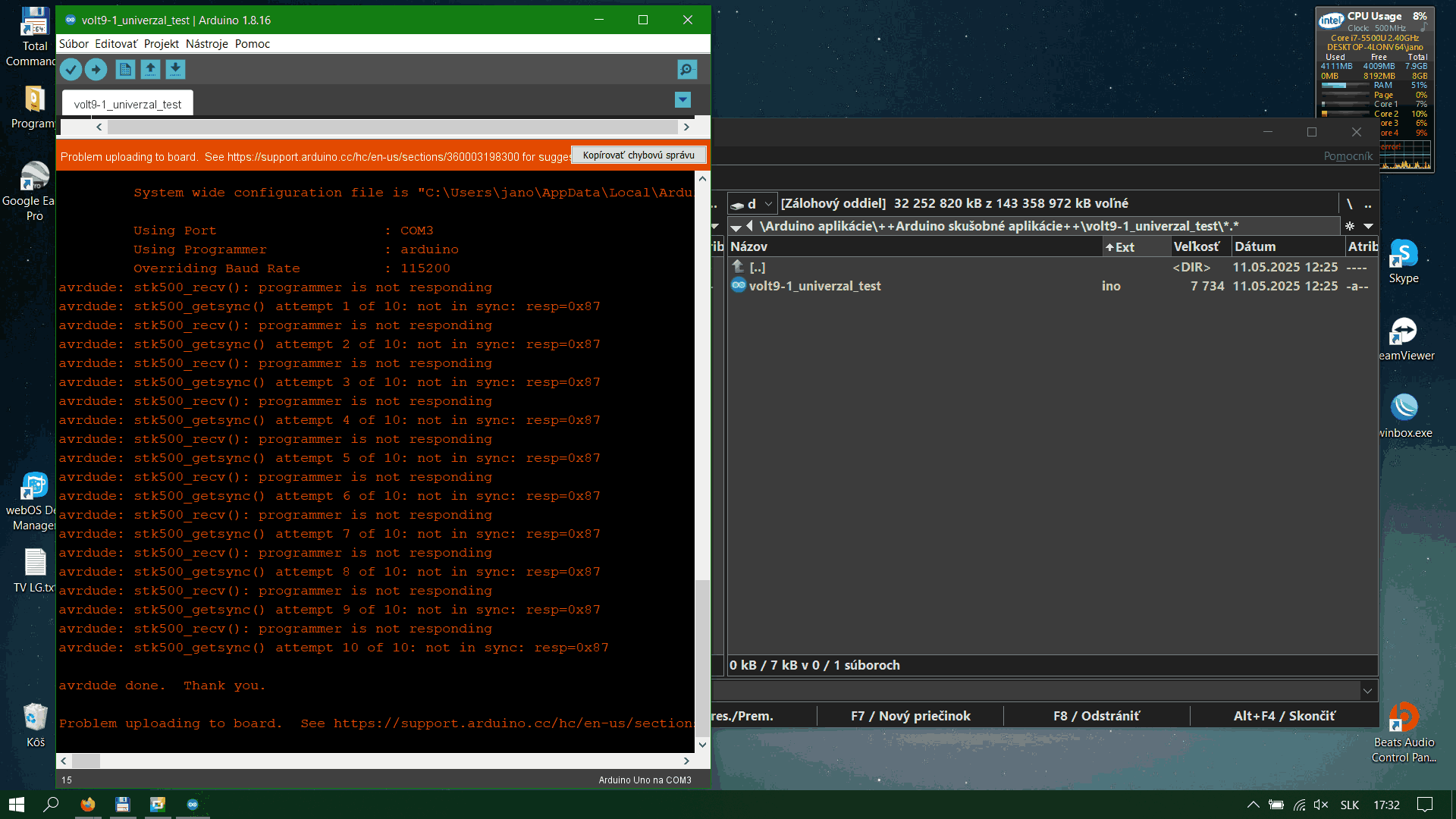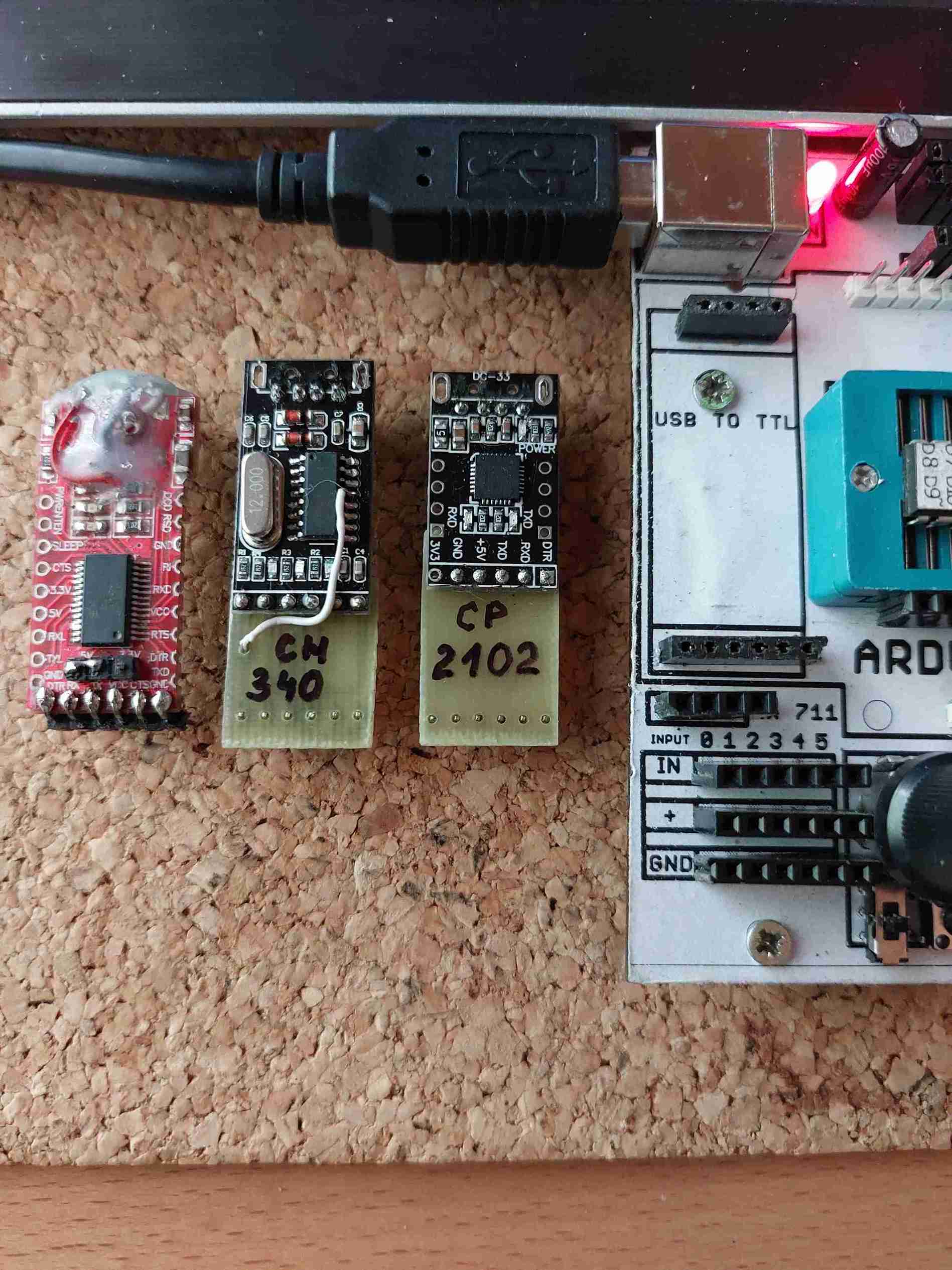 Zdravím. Chlapi, mám takýto problém. Podľa obrázku - mám arduino, (resp. Atmega 328PU), a chcem používať tieto prevodníky. Ľavý je FT232R, stredný je CH340, pravý je CP2102. Problém je ten, že FT mi komunikuje vždy a s každým procesorom, ti ostatné dva komunikujú iba s jedným procesorom z 9-ich ks a to nie vždy. Všetky procesory sú rovnaké typy- 328PU. Ostatných 8ks sa správajú rovnako. Kompilácia prebehne ale nahrávanie sa neuskutoční.